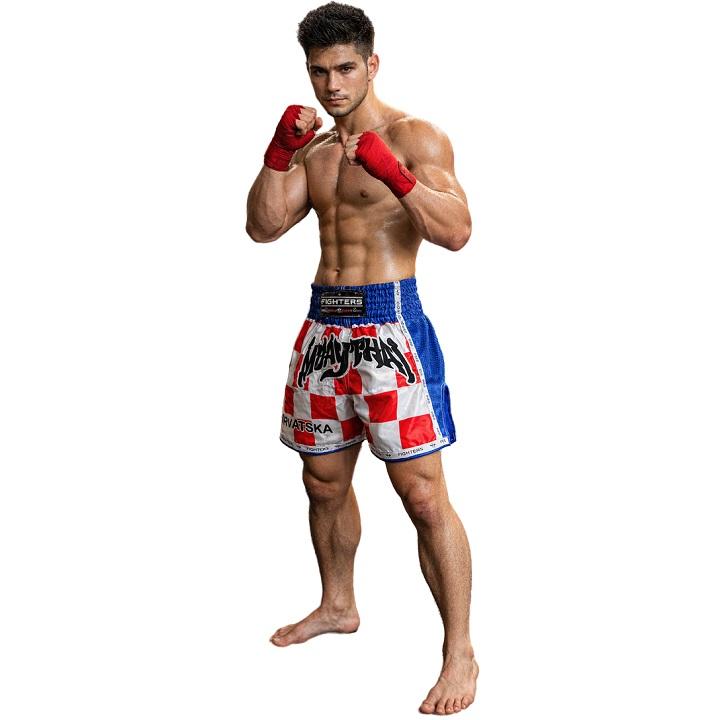 Kick-/Thaiboxing Shorts aus qualitativ hochwertigem edlem Satin. Hervorragende Verarbeitung (hand made). Weiss/Rote Thai Hose mit Wappen aus Kroatien und HRVATSKA Schriftzug. Mit breitem elastischen Bund und seitlichen Schlitzen für perfekten Tragekomfort. Schnürung in der Innenseite. Spezieller Schnitt für High-Kicks und Kniestösse.