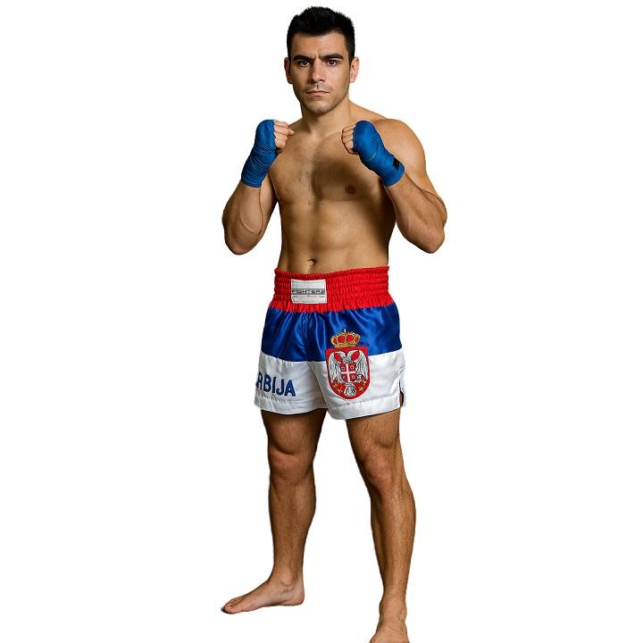 Kick-/Thaiboxing Shorts aus qualitativ hochwertigem edlem Satin. Hervorragende Verarbeitung (hand made). Rot/Blau/Weisse Thai Hose mit Wappen aus Serbien und eingestickter SRBIJA Schriftzug. Mit breitem elastischen Bund und seitlichen Schlitzen für perfekten Tragekomfort. Schnürung in der Innenseite. Spezieller Schnitt für High-Kicks und Kniestösse.